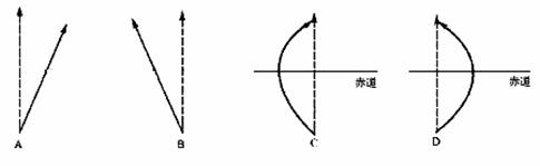 (6)从B点沿经线向D处方向发射卫星,则落到D的偏 (东、西)方向,原因是什么?下面四幅图中,能够正确说明该现象的是 ( )