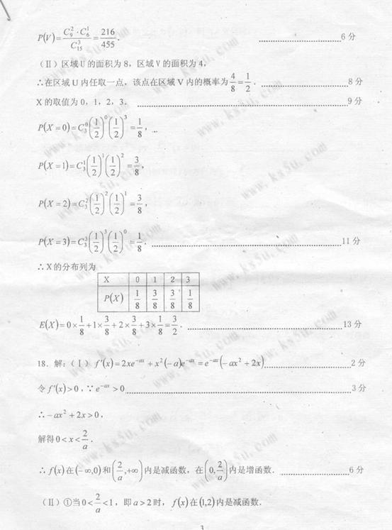 (II)在区域U内任取3个点,记此3个点在区域V的个数为X,求X的概率分布及其数学期望。