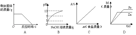 D.等质量的锌、铁与足量的稀硫酸反应,产生氢气的质量M与反应时间t的关系图