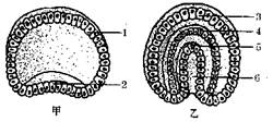(2)随着胚胎发育的进行,甲图中1处的细胞最可能成为乙图中[ ] 胚层的一部分,甲图中2处的细胞最可能成为乙图中[ ] 胚层的一部分。