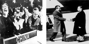 (1)上左图为1971年某次国际会议的永恒瞬间。中国外交部副部长乔冠华潇洒而豪放的大笑,被西方媒体描述为:“震碎了议会大厦的玻璃!”为何乔冠华部长会如此开怀畅笑?(2分)你认为出现此永恒瞬间的国际国内政治因素有哪些? (4分)