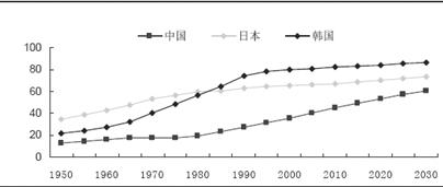 读中国、日本和韩国三国城市化进程曲线图,(根据人口学的纳瑟姆曲线,城市化率超过30%时,国家将进入高速城市化的阶段,直至城市化水平达到70%左右)回答23-24题。