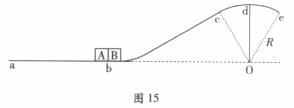 如图15所示,一条轨道固定在竖直平面内,粗糙的ab段水平,bcde段光滑,cde段是以O为圆心、R为半径的一小段圆弧。可视为质点的物块A和B紧靠在一起,静止于b处,A的质量是B的3倍。两物块在足够大的内力作用下突然分离,分别向左、右始终沿轨道运动。B到b点时速度沿水平方向,此时轨道对B的支持力大小等于B所受重力的