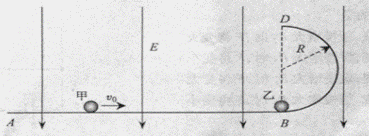 24.(安徽卷)(20分)如图,ABD为竖直平面内的光滑绝缘轨道,其中AB段是水平的,BD段为半径R=0.2m的半圆,两段轨道相切于B点,整个轨道处在竖直向下的匀强电场中,场强大小E=5.0×103V/m。一不带电的绝缘小球甲,以速度υ0沿水平轨道向右运动,与静止在B点带正电的小球乙发生弹性碰撞。已知甲、乙两球的质量均为m=1.0×10-2kg,乙所带电荷量q=2.0×10-5C,g取10m/s2。(水平轨道足够长,甲、乙两球可视为质点,整个运动过程无电荷转移)