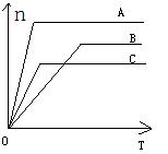 相等质量的A、B、C三种金属与足量的稀硫酸反应后生成+2价的硫酸盐,生成氢气的物质的量(m)与反应时间(T)的关系图如右图所示,则下列说法正确的……………………( )