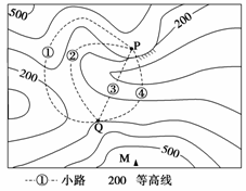 解析 从图中可以看出,P、Q两点之间的四条小路中,②线穿越的等高线最少,地形起