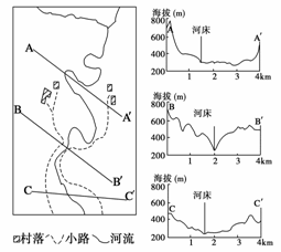 山地中深切(“V”形)河谷(峡谷);CC′剖面显示的是丘陵中的河谷。该小区域是山地(低山、