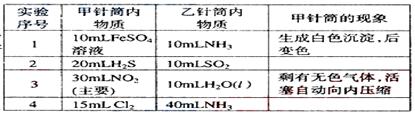 (4)实验4中,已知:3Cl2+2NH3=N2+6HCl。甲针筒出活塞有移动,针筒内有白烟产生外,气体的颜色变为____________。最后针筒内剩余气体的体积约为________mL。
