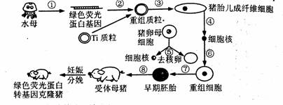 5.我国首例绿色荧光蛋白转基因克隆猪在东北农业大学的种猪场自然分娩产出,这标志着我国在转基因克隆猪技术领域已达到世界领先水平。下图为我国首例绿色荧光蛋白转基因克隆猪的培育过程示意图。下列说法正确的是