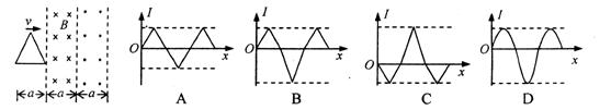 过宽均为a的两个匀强磁场。这两个磁场的磁感应强度大小均为B,方向相反。线框运动方向与底边平行且与磁场边缘垂直。取逆时针方向的电流为正,若从图示位置开始,则线框中产生的感应电流I与沿运动方向的位移x之间的函数图象,下面四个图中正确的是