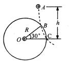 如图所示,在O点处放置一个正电荷。在过O点的竖直平面内的A点,自由释放一个带正电的小球,小球的质量为m、电荷量为q。小球下落的轨迹如图中虚线所示,它与以O为圆心、R为半径的圆(图中实线所示)相交与B、C两点,O、C在同一水平线上,∠BOC=30°,A距离OC的竖直高度为h。若小球通过B点的速度为v,则下列说法正确的