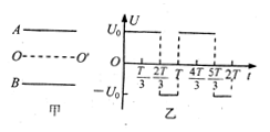 如图甲所示,平行金属板A和B间的距离为d,现在A、B板上加如图乙所示的方波形电压,t = 0时B板比A板的电势高,电压的正向值为U0,反向值也为U0。现有由质量为m的带正电且电荷量为q的粒子组成的粒子束,从AB的中点O以平行与金属板方向沿OO’以速