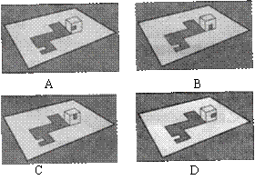 美术课上,老师要求同学们将右图所示的白纸只沿虚线裁开,用裁开的纸片和白纸上的阴影部分围成一个立体模型,然后放在桌面上,下列四个示意图中,只有一个符合上述要求,那么这个示意图是
