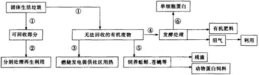 (2)垃圾实在是被人们放错了地方的资源,实现垃圾的“减量化、资源化和无害化”是绿色城市的重要标志之一。下图是垃圾资源化、无害处理的一种方案,此方案中①、②过程需要每一位市民的参与,具体做法是 。④、⑤过程利用的生物属于生态系统的何种成分? 。从对资源的充分利用角度看,④、⑤途径优于③途径的原因是 。