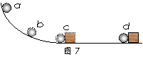 如图7所示,是探究“动能的大小与什么因素有关?”实验的示意图。小球从a处滚下,在c处与小木块碰撞,并与小木块共同运动到d处停下。下面的