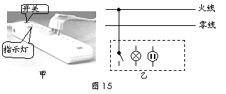 24.如图15甲所示,是小明常用的一个插线板。他在使用中发现:插线板上的指示灯在开关闭合时会发光,插孔正常通电;如果指示灯损坏,开关闭合时插孔也能正常通电。根据上述现象,在图15乙中画出插线板中开关、指示灯和插孔的连接方式,并与电源线接通。