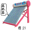 如图21所示的太阳能热水器,它的水箱容量为120L,热水器上的集热器对太阳能的利用效率为40%,在与阳光垂直的地球表面上每平方米得到的太阳辐射功率约为P=1400W。如果将整箱水的温度从20℃加热到70℃,需要阳光照射5h,那么: