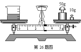 26.用天平测水的质量。将适量的水倒入质量为30g的空烧杯里,然后将其放在调节好的天平左盘内,当天平平衡时,右盘内的砝码与游码在标尺上的位置如图所示。则烧杯与水的总质量是 g,烧杯内水的质量是 g 。(2分)