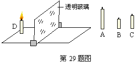 29.如图所示,是探究平面镜成像特点的实验装置,在四根蜡烛中,蜡烛C与点燃的蜡烛D大小完全相等。实验中,小明将点燃的蜡烛放在透明玻璃的左侧,可观察到玻璃中有蜡烛及烛焰的像。然后它依次的将蜡烛A、B、C放在透明玻璃的右侧,使其与像重合,三次实验发现,只有蜡烛C能与像完全重合。这说明蜡烛D在平面镜中所成的像与蜡烛D大小 。(2分)