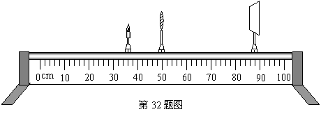 32.为了探究凸透镜成像的规律,小刚组装了如图所示的实验装置,凸透镜的焦距是10cm。在如图所示的实验装置中,蜡烛的高度需调整的在 一些(选填“高”或“低”)。实验装置调好后,若将蜡烛放在20cm的刻线处,凸透镜放在50cm的刻线处,通过移动光屏,可得到 实像。(2分)