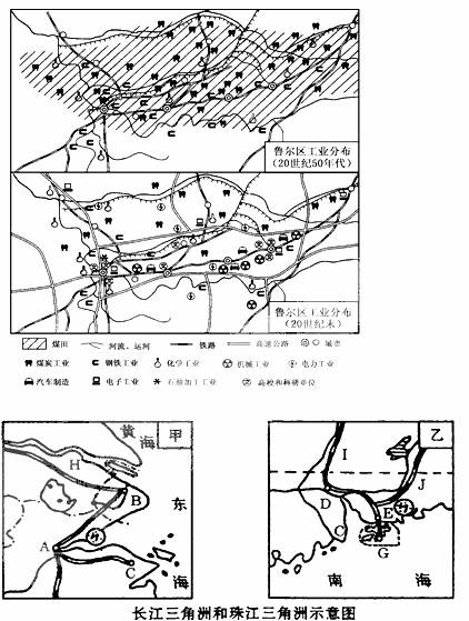 读德国鲁尔区在20世纪50年代、90年代的工业分布与工业部门变化示意图。分析回答下面27-29小题: