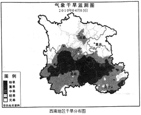 (3)西南地区是我国水资源丰富地区,今年这些地区干旱严重,反映了我国季风气候具有 的特点。简述造成图中重旱区干旱灾害严重的主要原因。试分析图示地区常形成干旱的原因。(10分)