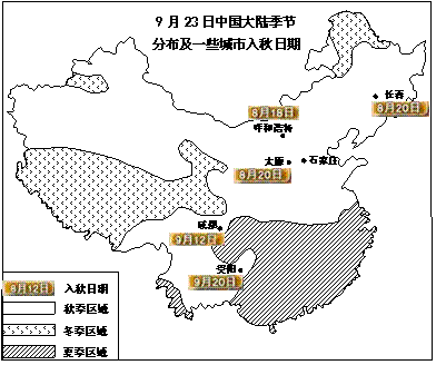 材料二 2009年9月23日中国大陆季节分布及一些城市进入秋季图。