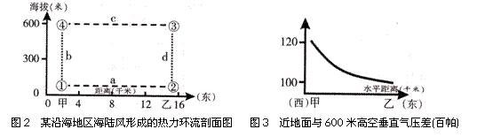 图2示意某沿海地区海陆风形成的热力环流剖面图,图3为该地区近地面与600米高空垂直气压差的分布状况,读图回答3-5题。
