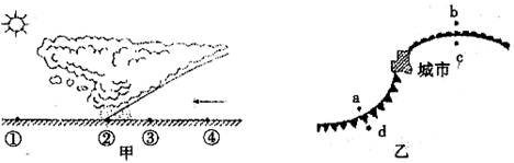 C.乙图中城市为晴朗天气 D. 乙图中c处出现降水天气