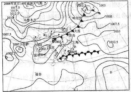 读我国某日天气图(单位:hPa),回答下列问题:(6分)