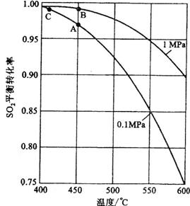 (3)精制炉气(含SO2体积分数为7%、O2为ll%、N2为82%)中S02平衡转化率与温度及压强关系如下图所示。在实际生产中,S02催化氧化反应的条件选择常压、450℃;左右(对应图中A点),而没有选择S02转化率更高的B或C点对应的反应条件,其原因分别是______________________________、______________________________;