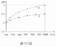 13.pH=2的两种一元酸x和y,体积均为100ml,稀释过程中pH与溶液体积的关系如图13所示。分别滴加NaOH溶液(e=0.1mol/L)至pH=7,消耗NaOH溶液体积为Vx,Vy,则