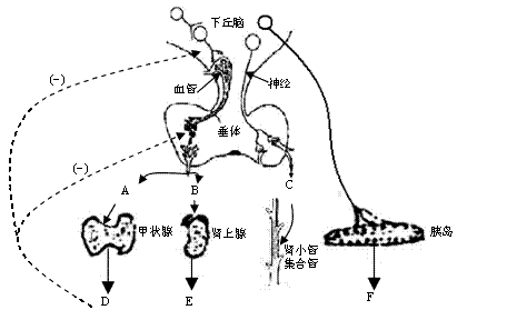 (3)若切除甲状腺的三分之一,激素D的分泌将会 ,激素A的分泌将会 ;若切断下丘脑与垂体之间的联系,血液中激素C的含量将会 ,家兔的尿量将 ,激素F的分泌量将 。