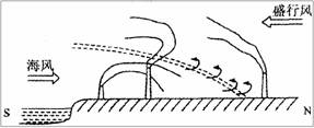 海陆风是热力环流的一种,假设下图是“我国北方沿海地区海风入侵时污染物输送状况示意图”,结合所学知识回答1-2题。