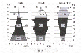 图2为亚洲某国人口金字塔,读图回答3-4题。