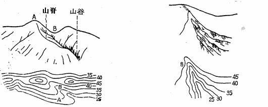 [解题思路]山脊和山谷:如图所示,山谷和山脊几乎具有同样的等高线形态,因而要从等高线的高程来区分,表示山脊的等高线是凸向山脊的低处,如图中A处.表示山谷的等高线则凸向谷底的高处,如图中B处。