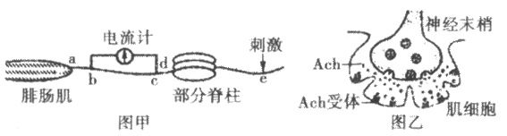 5、下图甲表示从青蛙体内分离出一部分新鲜的腓肠肌及相连的部分神经组织,图中a为神经纤维与腓肠肌细胞的连接处。图乙是图甲中a部位的放大图,其中Ach(乙酰胆碱)是一种兴奋型递质,当兴奋传到传出神经末梢时,Ach与Ach受体结合,引起肌肉收缩。(假设在实验过程中,适宜条件下肌肉和神经组织均能保持正常的结构和功能。