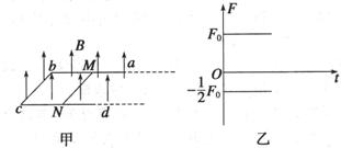 33.(14分)如图甲所示,空间存在竖直向上的磁感应强度为B的匀强磁场,ab、cd是相互平行的间距为l的长直导轨,它们处于同一水平面内,左端由金属丝bc相连,MN是跨接在导轨上质量为m的导体棒,已知MN与bc的总电阻为R,ab、cd的电阻不计。用水平向右的拉力使导体棒沿导轨做匀速运动,并始终保持棒与导轨垂直且接触良好。图乙是棒所受拉力和安培力与时间关系的图像,已知重力加速度为g。