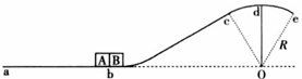 (18分)如图15所示,一条轨道固定在竖直平面内,粗糙的ab段水平,bcde段光滑,cde段是以O为圆心、R为半径的一小段圆弧。可视为质点的物块A和B紧靠在一起,静止于b处,A的质量是B的3倍。两物体在足够大的内力作用下突然分离,分别向左、右始终沿轨道运动。B到b点时速度沿水平方向,此时轨道对B的支持力大小等于B所受重力的