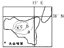 右下图中虚线是某岛火山喷发后火山灰厚度等值线,a<b<c,读图完成7-8题。