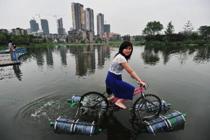 如图是某同学自制的水上自行车。她在普通自行车上安装8个密闭的空水桶(每个水桶体积为0.02米3),并在车后轮装上若干塑料片。该同学在水面上骑自行车匀速前进时,平均每个水桶约有二分之一体积浸在水 中,不计车轮和塑料片排开水的体积,则此时水上自行车受到的浮力约为 ▲