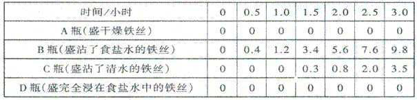 32.(3分)某学生在A, B,C,D四个小烧瓶中分别放人①干燥的细铁丝;③浸过食盐水的细铁丝;③浸过清水的细铁丝;④煮沸并冷却了的满满一瓶食盐水及细铁丝,并使铁丝完全浸没在食盐水中。然后装配成如图模一6所示的四套装置,每隔一段时间测量导管中水面上升的高度,结果如下表(表中所列数据为导管中水面上升的高度/cm)所示。(设环境温度和压强保持不变)