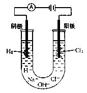 按图装置,在U形管里倒入饱和食盐水,插入一根石墨棒作阳极,一根铁棒作阴极。同时在两边管中各滴入几滴酚酞试液,并用湿润的碘化钾淀粉试纸检验阳极放出的气体。接通直流电源后,注意管内发生的现象。