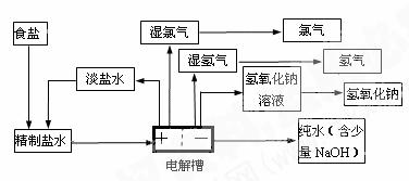 用惰性材料作阳极,电解食盐的饱和溶液,生成Cl2、H2和NaOH。
