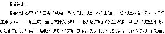 D. 电流计读数为零后,在甲中溶入FeCl2固定,乙中石墨电极为负极