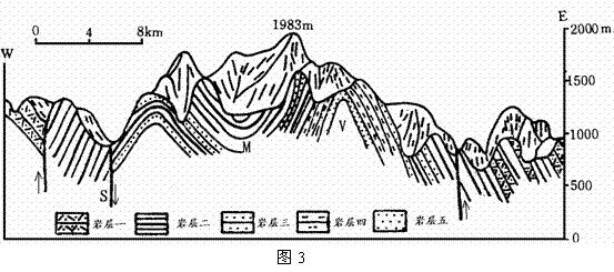 A.S-向斜-山谷 M-背斜-山地 V-断层-山谷 B.S-背斜-山谷 M-向斜-山地 V-断层-山谷