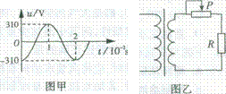 一理想变压器原、副线圈的匝数比为10:1,原线圈输入电压的变化规律如图甲所示,副线圈所接电路如图乙所示,P为滑动变阻器的触头。下列说法正确的是
