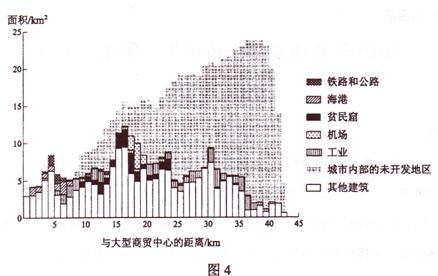 某沿海城市人口达1,600万,约60%居住在离市中心3千米的范围内。城市人口54%居住在贫民窟。图4示意该城市与大型商贸中心不同距离段的用地构成。据此完成11-13题。