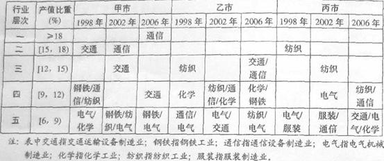 我国东部基地区是图内综合宾力较强.制造业较发达的区域。十多年来,甲市作为“雁头”,带动了作为“两翼”的乙、丙两市制造业结构的升级和优化。