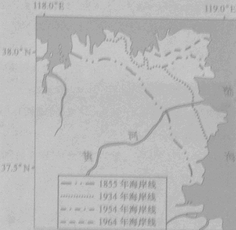 (1)考查区域地理环境的变化及其原因。从图中可以看出由于黄河流经黄土高原,携带大量泥沙进入下游入海口,由于流速减慢,泥沙不断沉积形成陆地。所以该区域陆地面积在不断扩大,并且不断向东北方向扩展;由于泥沙不断在增加,所以延伸速度越来越快。